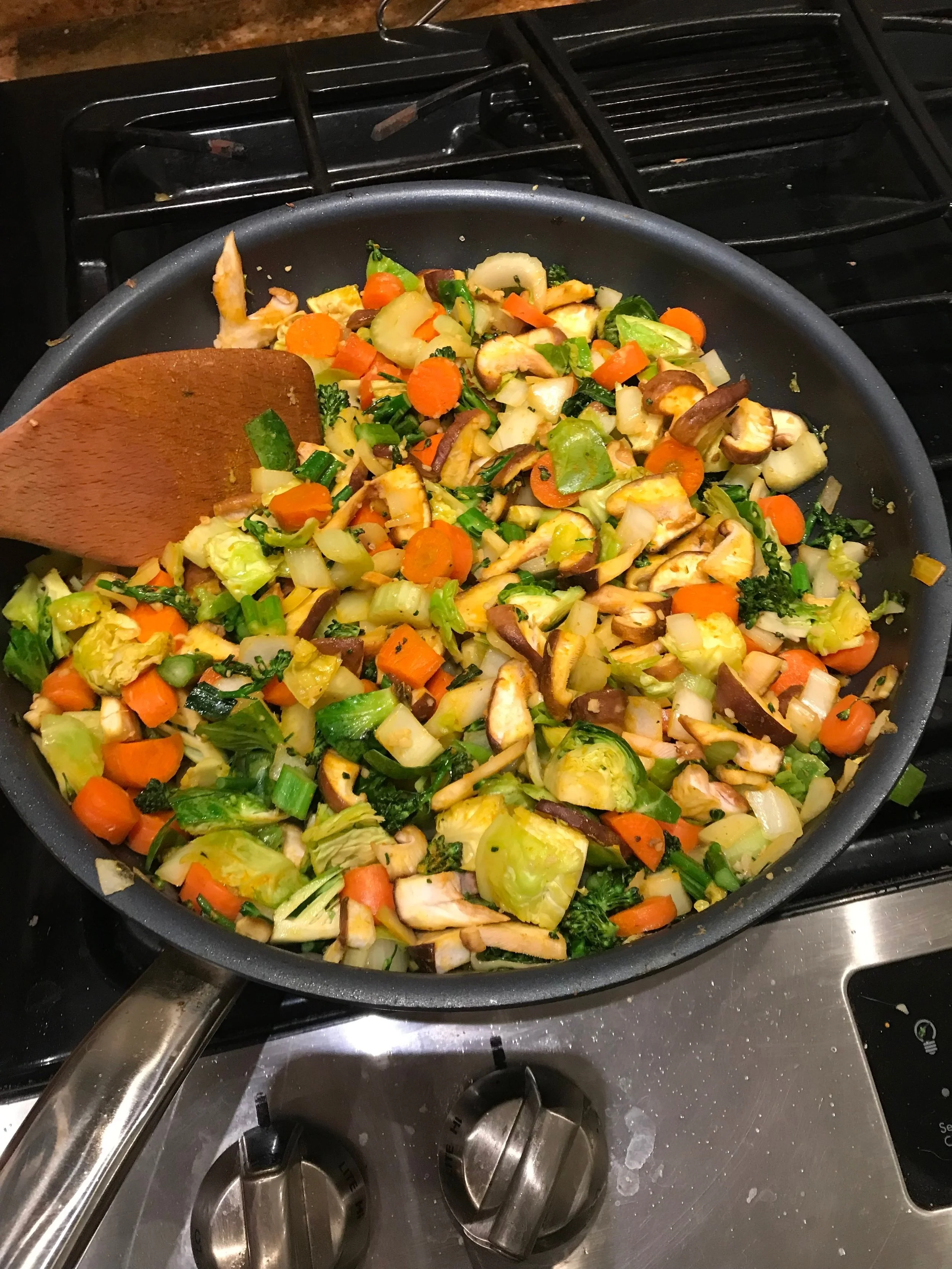 First, sauté all your veggies. I chopped up a bit of everything: carrots, celery, cauliflower, onion, mushrooms. Sautéed the onions first with garlic and olive oil until clear and then added the rest of the veggies. I added some salt, white pepper and rosemary for flavoring and of course, a can of unsalted peas.